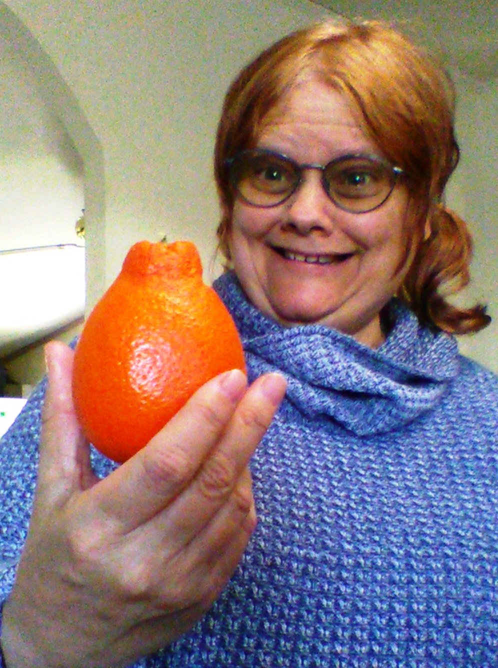 | Why is this orange shaped like a pear and why does my hand appear to be twice the size of my head? |